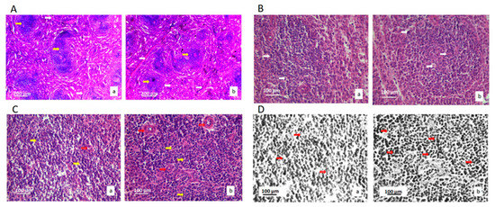Micrographs of the histological cross-section of the rat spleen of the control group (a) and the treated group (b), (H&E). (A) White arrows show connective tissue, and red arrows show lymphatic tissue. Magnification 200×. (B) White arrows show epithelial cells. Magnification 50×. (C) Yellow arrows show lymphocytes, and red arrows show blood vessels. Magnification 50×. (D) Red arrows show lymphocytes. Magnification 50×; digitally processed RGB technique.