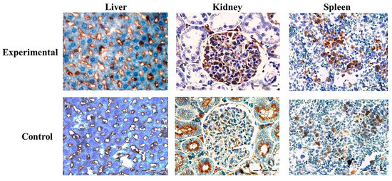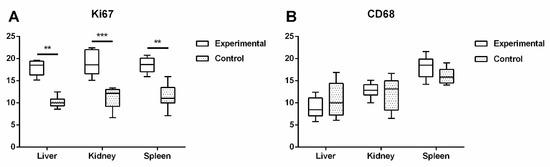 Expression of Ki67 protein was significantly higher in the experimental group of liver (p < 0.01), spleen (p < 0.003), and kidney tissue samples (p < 0.001), in comparison to the control (Figure 5 and Figure 6A).