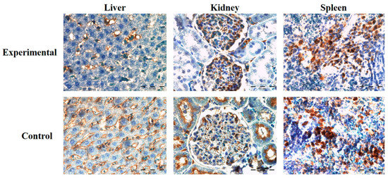 Protein expression of CD68 immunoreactive cells in kidney and liver was higher in the control in comparison to the experimental group, with no significant difference. In the spleen tissue sections, CD68-specific protein expression was higher in the experimental group but also showed no significant difference in comparison to the control (Figure 6B and Figure 7).