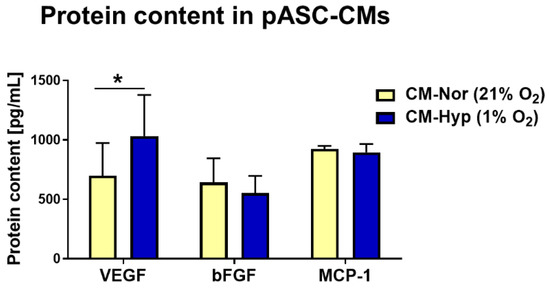 Bead-based quantification of protein levels secreted by pASCs cultured at 24 h in normoxia (21% O2; yellow bars; n = 7) or hypoxia (1% O2; blue bars; n = 7). Data are expressed as mean ± SD. * p < 0.05. Abbreviations: pASCs, pig adipose-derived stem cell; CM-Nor, conditioned medium collected from pASCs exposed to normoxia; CM-Hyp, conditioned medium collected from pASCs cultured under hypoxia.