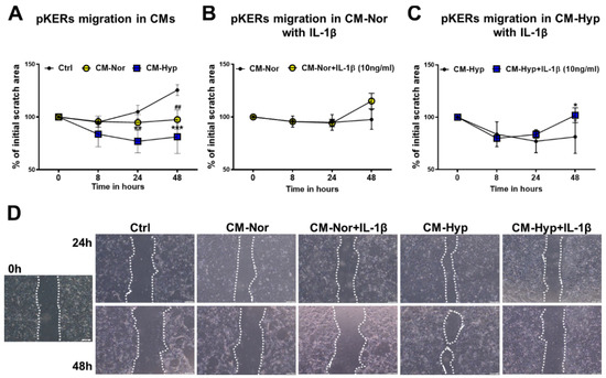 Effect of pASCs-CMs alone or supplemented with IL-1β (10 ng/mL) on migratory abilities of pKERs. Wound-healing scratch assay demonstrates increased cell migration upon administration with CM-Hyp (A). Supplementation of CM-Nor (B) or CM-Hyp (C) with IL-1β did not further increase pKERs motility relative to the cultures exposed to CMs alone. (D) Representative images depicting the stimulatory effect of CM-Hyp on pKERs movement at different time points (0, 24 and 48 h), and lack of effect of both CMs upon supplementation with IL-1β. The results are shown as the mean ± SD. The asterisks indicate significant differences between CM-Hyp exposed cells and control cultures (A) or CM-Hyp vs CM-Hyp+ IL-1β (C) (* p < 0.05; ** p < 0.01; *** p < 0.001). Hashes show significant differences between pKERs cultured in CM-Nor and control medium (## p < 0.01). Scale bars = 100 μm (D). Abbreviations: pASCs, pig adipose-derived stem cell; pKERs, pig keratinocytes; CM-Nor, conditioned medium collected from pASCs exposed to normoxia; CM-Hyp, conditioned medium collected from pASCs cultured under hypoxia; IL-1β, interleukin 1 beta.