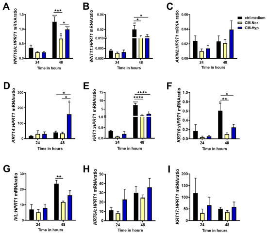 Quantitative analysis of (A) WNT10A, (B) WNT11, (C) AXIN2, (D) KRT14, (E) KRT1, (F) KRT10, (G) IVL, (H) KRT6A, and (I) KRT17 mRNA expression in pKERs exposed for 24 and 48 h to CM-Nor (yellow bars) or CM-Hyp (blue bars) relative to control-treated cells (black bars). The results are shown as the mean ± SD. The asterisks indicate significant differences between specific mRNA expression at 48 h (* p < 0.05; ** p < 0.01; *** p < 0.001; **** p < 0.0001). Hashes show significant differences in mRNA between 24 and 48 h of culture (# p < 0.05, ## p < 0.01, #### p < 0.0001). Abbreviations: pKERs, pig keratinocytes; CM-Nor, conditioned medium collected from pASCs exposed to normoxia; CM-Hyp, conditioned medium collected from pASCs cultured under hypoxia.