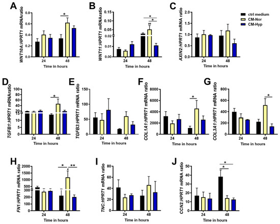 Quantitative analysis of: (A) WNT10A, (B) WNT11, (C) AXIN2, (D) TGFB1, (E) TGFB3, (F) COL1A1, (G) COL3A1, (H) FN1, (I) TNC, and (J) CCN2 mRNA expression in pDFs exposed for 24 and 48 h to CM-Nor (yellow bars) or CM-Hyp (blue bars) relative to control-treated cells (black bars). The results are shown as the mean ± SD. The asterisks indicate significant differences between specific mRNA expression at 48 h (* p < 0.05; ** p < 0.01). Hashes show significant differences in mRNA between 24 and 48 h of culture (# p < 0.05; ## p < 0.01). Abbreviations: pDFs, pig dermal fibroblasts; CM-Nor, conditioned medium collected from pASCs exposed to normoxia; CM-Hyp, conditioned medium collected from pASCs cultured under hypoxia.