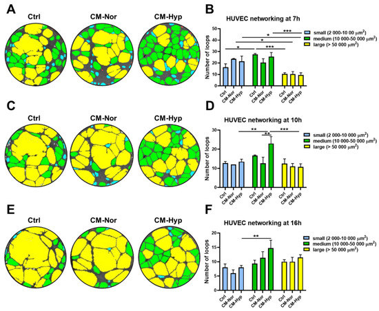 CM-Hyp increases formation and survival of HUVEC networking. Representative pictures of endothelial cells tube formation in CM-Nor, CM-Hyp, or control medium and their analysis at (A,B) 7 h, (C,D) 10 h, and (E,F) 16 h of culture demonstrated small-(blue), medium-(green), and large- (yellow) sized loops. The results are shown as the mean ± SD. The asterisks indicate significant differences in loops number between specific media (* p < 0.05, ** p < 0.01, *** p < 0.001). Abbreviations: HUVEC, human umbilical vein endothelial cells; CM-Nor, conditioned medium collected from pASCs exposed to normoxia; CM-Hyp, conditioned medium collected from pASCs cultured under hypoxia.