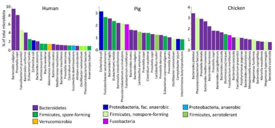 However, gut microbiota consists of hundreds of bacterial species with a neutral to positive relationship with its host, and there is no justification why additional species from other genera could not be used as well. Data from microbiota studies using next generation sequencing show that Lactobacilli dominate in the small intestine, but in the caecum or colon, Lactobacilli and Bifidobacteria do not represent the dominant microbiota members [,,,]. Instead, other genera and species are more characteristic for distal parts of the intestinal tract, and this is common among distantly related species such as humans, pigs or chickens (Figure 1). Despite this, Lactobacilli and Bifidobacteria are used in all these species as probiotics [,,],. In some cases, even the same species, such as Lactobacillus plantarum, has been tested in different hosts [,,]. However, at least in chickens, orally administered Lactobacilli do not permanently colonize the intestinal tract []. It can be argued that humans already have had a positive experience with Lactobacilli or Bifidobacteria as probiotics []. However, considering candidate probiotic gut microbiota without any bias, prior human experience with currently used probiotics cannot compare to evolution and natural selection, which have been operating for millions of years. This why in this review we remind readers that corrective actions towards intestinal disorders may also be achieved with other gut microbiota members; we carefully propose that if the function and ecology of the other microbiota members is understood and followed, benefits for the animal hosts might be even higher than after administration of lactic acid probiotics.