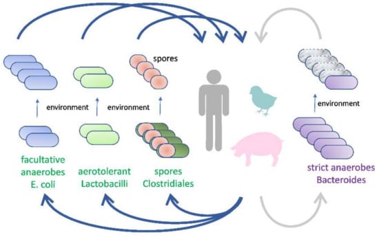 Bacterial species from the remaining two classes, Erysipelotrichia and Clostridia, represent common gut microbiota members that belong to the core microbiota of many warm-blooded hosts. Though common in different hosts, recent findings point towards a specific mode of colonization due to their distinct life cycle associated with spore-formation. Spore-forming bacteria are rarely shared between genetically related individuals from different households, and instead, higher similarities in the composition of spore-formers are observed among genetically unrelated humans sharing the same household []. However, when metagenomic sequences were compared, those belonging to endospore-forming Firmicutes differed even between mothers and their children living within the same household [,], indicating independent colonization from environmental sources. Spore-forming Clostridiales exhibit increased variability yet tend to be less dominant members of the community [,,] (Figure 1). In chickens, it is impossible to efficiently colonize newly hatched chicks with pure cultures of different endospore-forming Firmicutes [], and the presence of Lachnospiraceae and Ruminococcaceae in the caecum of chicks from commercial hatcheries [,], i.e., in the birds without any contact with adult hens, is in fact direct evidence of an exclusive environmental origin of these bacteria. Spore formers are found mainly in these two families, although the inactivation of vegetative cells and the culture of spore-forming bacteria shows that family Lachnospiraceae represents a major spore-forming population in the human gut []. These bacteria are common to the intestinal tract and include major butyrate producers [], yet it seems rather difficult to achieve successful colonization of the target host after experimental administration. An explanation of all of these observations is that due to prolonged survival of endospores in the environment - these bacteria do not need to colonize the intestinal tract permanently after every possible opportunity. Instead, these species are continuously supplied from the environment, and a balance between environmental supply, anaerobic replication in the gut and excretion back to the environment allows them to persist in the gut. Due to their ecology and environmental origin, demands on their origin need not to be that strict, and human isolates might be of similar efficacy if used in pigs or chickens. However, if these species are to be used as probiotics, they will have to be continuously supplied. Despite this, it will have to be kept in mind that experimental supplementation will always compete with a continuous supply of endospore-forming Firmicutes from the environment, which may compromise and interfere with the probiotic effect after experimental intervention. Since the natural spread of this type of bacteria is via endospores, their supplementation in the form of endospores rather than in the form of vegetative cells should be considered. Once their supplementation is finished, they may gradually disappear from the intestinal tract. Endospore-forming Firmicutes represent a specific group of gut anaerobes. Interestingly, there are Lachnospiraceae or Ruminococcaceae members which lost the ability to form endospores, e.g., Faecalibacterium, Oscillibacter or Roseburia []. It will be interesting to follow the ecology and natural dissemination of these genera to learn more about novel types of adaptation evolving after the loss of sporulation capacity.