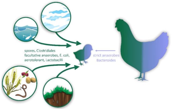 Non-spore-forming gut anaerobes belong mainly to phylum Bacteroidetes but can also be found among Proteobacteria, Verrucomicrobia, Fusobacteria, Spirochaetes, Elusimicrobia or Synergistetes. There is also an order within Firmicutes, Selenomonadales, isolates of which lost the ability of spore-formation, and instead, captured genes which enable them to produce an outer membrane characteristic of Gram-negative bacteria []. All these bacteria do not express any specific form of adaptation to an aerobic environment, which influences their ecology. Non-spore-forming gut anaerobes are less likely to be found across multiple individuals than those capable of spore formation [], and in agreement, host-dependent adaption of different species within genus Bacteroides has been described []. Bacteria no longer capable of sporulation are usually less prevalent but more abundant compared to spore-formers, suggesting an increase in colonization capacity []. Bacteroides species are vertically transferred from mothers to offspring, both in humans and chickens [,]. These bacteria are efficiently transferred by fecal transplantation in humans [], and if administered to newly hatched chicks, they efficiently colonize the caecum after a single dose administration [,]. Interestingly, despite host adaptation, chicks can be equally colonized by both chicken- and human-adapted species [], although only the chicken-adapted species will remain present until adulthood []. Their inability to extend environmental survival is therefore compensated for by their efficient colonization at the first opportunity and the slightly higher oxygen resistance of their vegetative cells than vegetative cells of spore-forming Clostridiales []. The slightly increased survival of vegetative cells is, however, incomparable with spore resistance. Since these bacteria are usually present at higher abundance in gut microbiota, they are also excreted in the feces in higher abundance, which increases the probability of reaching a new host. If the vertical transfer these microbiota members is affected, such as in caesarean section-delivered infants [,] or in chicks in commercial production hatched in the absence of adult hens [], environmental sources are usually not rich enough to provide such bacteria. These are the reasons why these bacteria should be considered as the targets for novel types of probiotics. Due to their evolutionary adaptations, a single dose of administration is usually enough to restore their presence in the digestive tract. All of this suggests that the non-spore-forming strict anaerobes from genera Bacteroides, Prevotella, Parabacteroides, Barnesiella, and Alistipes, but also those from Sutterella, Parasutterella, Succinatimonas, Akkermansia, Phascolarctobacterium, Megamonas, Megasphaera, Veillonella or Dialister, are promising candidates for novel types of probiotics.