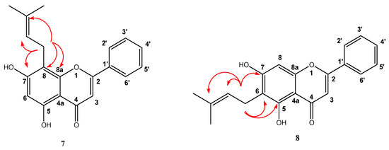 2D 1H-13C HMBC spectrum obtained for compounds 7 and 8. Here, the projections of the full spectrum 1H NMR and projections between 100 and 158 ppm for 13C NMR spectrum are represented. Only the main correlations between aromatic peaks and prenyl chain are shown.