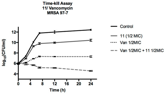 Time kill assay vancomycin with compound 11 on MRSA 97-7.