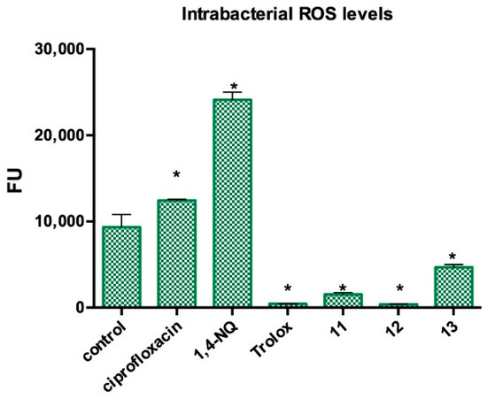 The results of the bacterial ROS level are shown in Figure 3. We can see that there is a significant decrease in ROS levels inside the bacteria as compounds 11, 12, and 13 are present, showing a protective effect by reducing ROS, with an effect as important as that shown by the agent Trolox, a known ROS species trapper. It has been described in the literature that polyhydroxylated flavonoids can act as antioxidant agents, trapping ROS [36], and this antioxidant property can be related to the ROS-reducing effect observed in this assay.