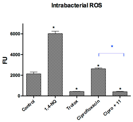 Effect of prenylated compounds in intrabacterial ROS levels in Staphylococcus aureus ATCC6538. Control: DMSO. Trolox: ROS scavenger control. 1,4-NQ (1,4-Naphtoquinone): ROS generator control. Ciprofloxacin (0.05 µg/mL): commercial antibiotic control. 11–13: prenylated compounds in evaluation (1/2 MIC concentration). Statistical analysis: Mann–Whitney U test (*) p < 0.05, between each treatment with the negative control.