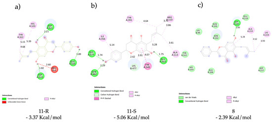 Docking results: main interactions of the stereoisomers of 11 ((a) (R)-11 and (b) (S)-11) and 8 (c) with ATP binding cassette.