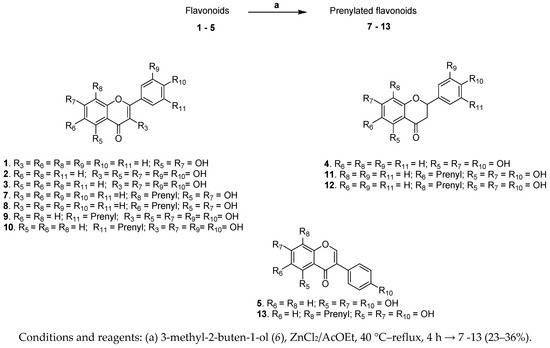 Prenylated flavonoids are a subclass of natural flavonoids characterized by the presence of a prenylated side chain (i.e., prenyl, geranyl and lavandulyl) attached to the flavonoid skeleton. Since prenylated flavonoids are generally more bioactive than their non-prenylated precursors, they are of interest as lead compounds for producing new drugs [1,2,3]. However, since prenylated flavonoids often exist at trace levels in their natural sources that make further biological studies difficult, it may be useful to synthesize prenylated flavonoids in appreciable quantities and at low costs to allow future biological studies [4]. Compounds of this type exhibit significant effects in the insect–plant interaction [5] as well as antifungal [6], antimicrobial [7], antiviral [8,9], anti-inflammatory [10], and anticancer [11] activities and anti-lipid properties, both in vitro and in vivo [12]. The C-prenylation of flavonoids seems to be crucial to the biological activities of these compounds, which may lead to enhanced cell membrane targeting and thus increased intracellular activity [13]. From a chemistry point of view, the C-prenylation is complicated, inefficient, and time-consuming, so other methods must be explored; i.e., biocatalysis may be the solution to these problems [14,15]. The prenylation of the flavonoid core increases lipophilicity and membrane permeability, which is one of the proposed reasons for the enhanced biological activities of prenylated flavonoids [16]. Efficient chemistry methods to obtain 8-prenylnaringenin with reasonable yields (20–33%) have been reported via Claisen and Claisen–Cope rearrangement [17] in many steps. A good approximation to obtain these kinds of compounds may be the direct prenylation of commercially available flavonoids with 3-methyl-2-buten-1-ol using ZnCl2 as Lewis acid by coupling via an aromatic electrophilic substitution reaction (ArES), whose conditions have been used to obtain prenylated phenols in our laboratory [18].