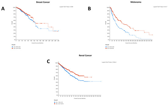 Statistically significant Kaplan–Meier plots for pan-cancer CD274 expression. In all cases, overall survival in months can be seen on the x-axis whilst percentage survived is shown on the y-axis. In all cases, high CD274 expression is shown in red whilst low CD274 expression is shown in blue. Data were generated using the mRNA expression z-scores relative to diploid samples (RNA Seq V2 RSEM) for the studies described in the Materials and Methods. CD274 expression was a significant factor for patient survival only in breast cancer (A), melanoma (B), and renal cancer (C). As such, bladder, cervical, colorectal, esophageal, gastric, head and neck, liver, lung, lymphoma, mesothelioma, ovarian, and pancreatic cancers have not been shown here but are available in Figure S1. Additionally, the mesothelioma study included (Mesothelioma (TCGA, Firehose Legacy)) lacked usable Kaplan–Meier survival data.