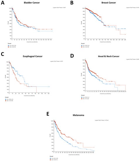 Statistically significant Kaplan–Meier plots for pan-cancer PDCD1 expression. In all cases, overall survival in months can be seen on the x-axis whilst percentage survived is shown on the y-axis. In all cases, high PDCD1 expression is shown in red whilst low PDCD1 expression is shown in blue. Data were generated using the mRNA expression z-scores relative to diploid samples (RNA Seq V2 RSEM) for the studies described in the Materials and Methods. PDCD1 expression was a significant factor for patient survival only in bladder cancer (A), breast cancer (B), esophageal cancer (C), head and neck cancer (D), and melanoma (E). As such, cervical, colorectal, gastric, liver, lung, lymphoma, mesothelioma, ovarian, renal, and pancreatic cancers have not been shown here but are available in Figure S2. Additionally, the mesothelioma study included (Mesothelioma (TCGA, Firehose Legacy)) lacked usable Kaplan–Meier survival data.