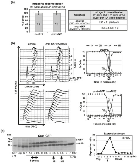 Crs1-GFP functionality and expression. (a) Recombination assays showing that Crs1-GFP is proficient for recombination. Crosses of h− ade6-M26 x h+ ade6-3049 in MEA were performed and plated for recombinant frequency twice. Table shows gene conversion (intragenic recombination) expressed as the mean of Ade+ per 104 viable spores +/−SEM of 3 independent crosses based on the cumulative number of spore colonies in each cross; 168–294 Ade+ colonies scored in each independent cross. The numbers in parentheses are percentages relative to wild-type control. Strains used in the crosses are indicated. Graph shows same data as mean of the percentage relative to the control cross +/−SEM. (b) Flow cytometry analysis of synchronous meiosis of diploid pat1-114 control (CMC1074) and pat1-114 crs1-GFP (CMC1000) cells. DNA content (FL2-H) and Size (FSC) histograms are shown. Dashed-lined box outlines S-phase progression. On the right: Quantification of chromosome segregation by DAPI staining and nuclear counting (1 nucleus, 2 nuclei, 3 nuclei, and 4 nuclei) is shown. The arrows indicate meiosis I (MI) entry, and the vertical dashed-lines indicate the peak of MI. (c) Crs1-GFP protein expression during synchronous diploid pat1-114 meiosis (CMC1000). Same blot was sequentially used with anti-GFP and anti-Actin antibodies. On the right, mRNA expression levels during synchronous diploid pat1-114 meiosis (microarrays data from Pombase).