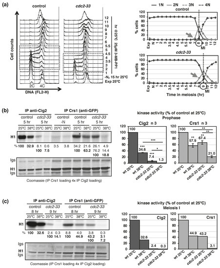 Next, we addressed its putative kinase activity in prophase, when maximal expression and DSB formation occurs. Kinase activity was measured in vitro using histone H1 as a substrate, and a cdc2-33 temperature sensitive allele that allowed us to compare kinase activity at permissive and restrictive temperature to address Cdc2-dependency [50,51,52]. Synchronous meiosis of control and cdc2-33 mutant were induced by chemical inhibition (3-MB-PP1) of the Pat1-as1 (L95G) kinase at 25 °C (Figure 2a) [53]. Extracts from cells collected at the beginning of meiosis (-N) and at 5 h after meiotic induction (prophase) were immunoprecipitated with antibodies anti-GFP (Crs1-GFP) and anti-Cig2 as a control, split in two, and assayed for kinase activity at 25 °C (cdc2-33 permissive temperature) and 38 °C (cdc2-33 restrictive temperature) (Figure 2b). As previously reported [54,55], Cig2 cyclin showed associated kinase activity that was temperature sensitive (kinase activity in cdc2+ control cells at 38 °C was 34.6% +/−0.9 SEM of that observed at 25 °C, p value 2.1 × 10−7 ), and Cdc2-dependent (kinase activity in cdc2-33 mutant cells at 25 °C was 7.4% +/−2.0 SEM of that observed in cdc2+ control cells, p value 1.4 × 10−6; and it was drastically reduced to 1.3% +/−0.4 SEM in cdc2-33 mutant cells at 38 °C, p value 4.2 × 10−6). Interestingly, we did detect kinase activity associated to Crs1, though less activity than the one detected in Cig2 immunoprecipitates (6.87% +/−0.86 SEM, p value 0.0043). Indeed, in order to have alike signals to compare and quantify reliably, Crs1 assays were loaded 4-folds compared to Cig2 assays. As for Cig2, Crs1 showed associated kinase activity that was temperature sensitive and Cdc2-dependent (Figure 2b). Kinase activity in cdc2+ control cells at 38 °C was 57.9% +/−6.0 SEM of that observed at 25 °C, p value 0.0021; kinase activity in cdc2-33 mutant cells at 25 °C was 67.4% +/−5.8 SEM of that observed in cdc2+ control cells at the same temperature, p value 0.0048; and it was strongly reduced to 21.0% +/−3.3 SEM in cdc2-33 mutant cells at 38 °C, p value 0.0056. The temperature sensitivity of the kinase activity associated to these cyclins is not a consequence of the high temperature in the assay (38 °C) since cyclin Cdc13-associated kinase activity is not temperature sensitive (Figure S1).