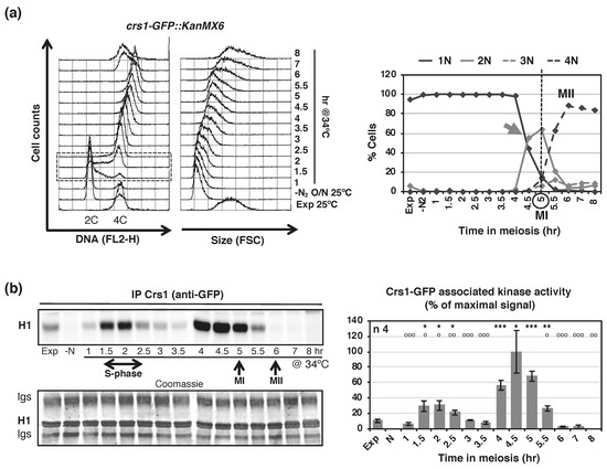 Next, we decided to study Crs1-associated kinase activity along a complete synchronous meiosis. Surprisingly, we detected two waves of Crs1-associated kinase activity, one at S-phase and a higher one before meiosis I entry, with good statistical definition of both peaks and statistical difference between peaks (Figure 3). Thus, we reevaluated Cdc2-dependency at one of these waves, meiosis I entry. As shown in Figure 2c, Cdc2-dependency was confirmed; Crs1-associated kinase activity in cdc2-33 mutant cells at 25 °C dropped to 43% of the control at the same temperature, and to 3% in the mutant at 38 °C. The kinetics of Crs1-asociated kinase activity was very different from the reported expression of the RNA and the protein (http://www.pombase.org/spombe/result/SPBC2G2.09c, expression viewer and pombeTV [49], last accessed date 19 February 2021; and Figure 1), indicating that Crs1-associated kinase activity may have a strong post-translational regulation.