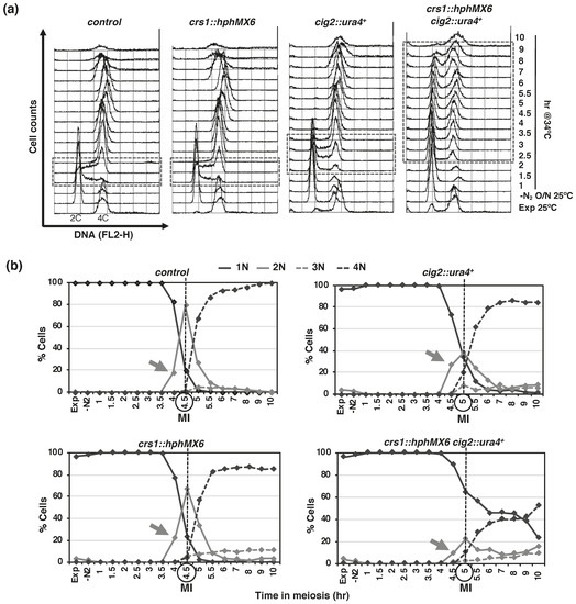 - Borgne, A.; Murakami, H.; Ayté, J.; Nurse, P. The G1/S Cyclin Cig2p during Meiosis in Fission Yeast. Mol. Biol. Cell 2002, 13, 2080–2090. [Google Scholar] [CrossRef] [PubMed]
