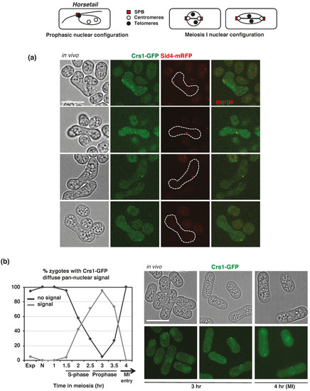 In vivo Crs1-GFP and Sid4-mRFP localization. Top panels: Schematic drawing of SPB, centromeres, and telomeres position during prophase and meiosis I is shown. (a) In vivo Crs1-GFP and Sid4-mRFP (SPB component) co-localization in prophase in h90 zygotes (CMC1076). Single plane bright-field images on the left help to localize the nucleus, which appears as a smooth area more or less stretched depending on the nuclear movement in a rugged context. Notice the Crs1-GFP pan-nuclear diffuse signal in the upper zygote. Crs1-GFP focus and pan-nuclear signal were not always visible in the same focal plane. Crs1-GFP images correspond to single planes, and Sid4-mRFP images correspond to maximal projections of Z sections. In some zygotes, the co-localization was not perfect due to the quite different exposure time to detect the signals (2.5 s for Crs1-GFP and 0.2 s for Sid4-mRFP) and the vigorous nuclear movements at this phase of meiosis. (b) Crs1-GFP pan-nuclear signal during synchronous diploid pat1-114 meiosis (CMC1000). Graph represents the percentage (mean of 2 independent experiments) of zygotes with and without Crs1-GFP diffuse pan-nuclear signal during the time course. On the right: Photographs of cells in prophase (3 h after meiotic induction) and meiosis I entry (4 h) are shown. Single plane bright-field images on top help to position the nucleus, which appears as a smooth area often distally located depending on the nuclear movement in a rugged context. Apart from the Crs1-GFP pan-nuclear signal, notice that the Crs1-GFP focus (SPB) is also visible in most of the cells. Pan-nuclear and focus Crs1-GFP signal were not always visible in the same plane. Images correspond to single planes. At least a total of 40 cells were analyzed at each time point, increasing the number of cells to 174–274 from 1.5 to 3.5 h. Scale bar corresponds to 5 µm in all the images in the figure.