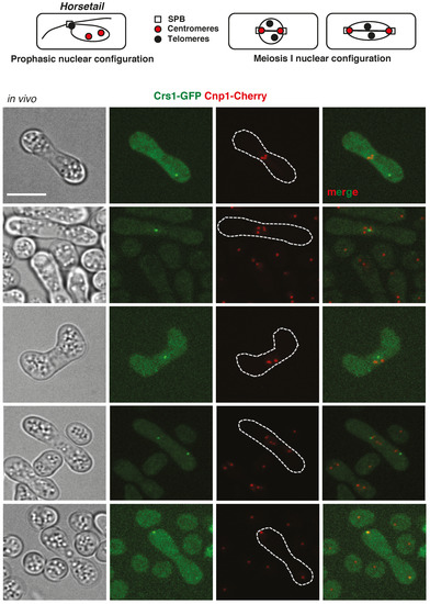 In vivo Crs1-GFP and Cnp1-Cherry localization. Top panels: Schematic drawing of SPB, centromeres, and telomeres position during prophase and meiosis I is shown. Bottom panels: In vivo Crs1-GFP and Cnp1-Cherry (centromere component) distribution in prophase and meiosis I in h90 zygotes (CMC1073). Single plane bright-field images on the left help to localize the nucleus, which appears as a smooth area more or less stretched depending on the nuclear movement in a rugged context. Notice Crs1-GFP pan-nuclear diffuse signal in the upper zygote. Crs1-GFP focus and pan-nuclear signal were not always visible in the same focal plane. Notice co-localization of Crs1-GFP and Cnp1-Cherry only at the cell poles in anaphase I (when centromeres of the segregating chromosomes reach the SPB). Crs1-GFP images correspond to single planes, and Cnp1-Cherry images correspond to maximal projections of Z sections. Scale bar corresponds to 5 µm.