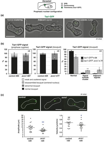 Bouquet formation and nuclear movement in crs1 deletion mutants. Top panel: Schematic drawing of SPB, centromeres, and telomeres position during meiotic prophase is shown. (a) In vivo Taz1-GFP (telomeres) localization in prophase in h90 wild-type (CMC1276) and crs1 mutant (CMC1274) zygotes. Single plane bright-field images are overlapped to single plane Taz1-GFP images. Examples of zygotes with normal bouquet organization (normal Taz1-GFP clustering) and abnormal bouquet organization (adjacent Taz1-GFP signals and Taz1-GFP signals outside of the main cluster) are shown. (b) Left graph: Quantification of Taz1-GFP organization in wild-type and crs1 deletion mutants. Data are the mean of the percentage of each category +/−SEM of three independent experiments with a total of 63 control and 87 crs1 zygotes analyzed. In addition to “normal bouquet” and “abnormal bouquet” categories described in (a), similar low percentages of zygotes were observed in wild-type and crs1 mutants with disassembled bouquets (centered rounded-nuclei with intense scattered Taz1-GFP signal), and very weak and scattered signal in more elongated nuclei. Middle graph: Quantification of bouquet organization (normal and abnormal categories) in the same experiments. Fifty-four control and 77 crs1 zygotes analyzed. Right graph: Quantification of bouquet defects in wild-type and crs1 deletion mutants in the same experiments. (c) Top images: Examples of cluster disorganization in crs1 mutants (frames from time lapse experiments shown in Figures S3–S5). Bottom graphs: Quantification of the amplitude and velocity of nuclear movements in wild-type and crs1 deletion mutants by Taz1-GFP tracking. Individual data are plotted, and the mean +/−SEM is indicated. Pooled data of two independent experiments with a total of 20 control and 20 crs1 zygotes analyzed. p value * < 0.05, ** ≤ 0.01 (Student’s t-test, unpaired, two tails). Scale bar corresponds to 5 µm in all the images in the figure.