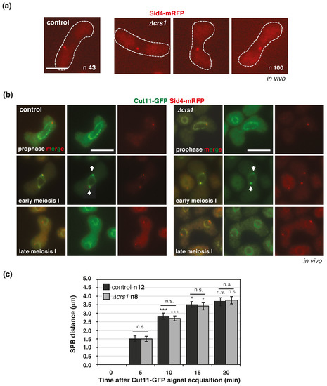 The following are available online at https://www.mdpi.com/article/10.3390/ijms22115483/s1, Figure S1: Cig2 but not Cdc13 shows thermosensitive kinase activity, Figure S2: Meiosis progression of cig2 and crs1 mutants, Figure S3: Time lapse of h90 taz1-GFP zygote, Figure S4: Time lapse of h90 taz1-GFP crs1 zygote, Figure S5: Time lapse of h90 taz1-GFP crs1 zygote, Figure S6: In vivo Crs1-GFP and Sid4-mRFP localization in bqt1 mutants, Table S1: S. pombe strains, Video S1: Time lapse of h90 sid4-mRFP cut11-GFP zygotes, Video S2: Time lapse of h90 sid4-mRFP cut11-GFP zygotes, Video S3: Time lapse of h90 sid4-mRFP cut11-GFP crs1 zygotes, Video S4: Time lapse of h90 sid4-mRFP cut11-GFP crs1 zygotes.