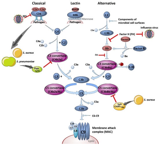The complement system and its role in pathogen clearance. Schematic overview of the activation of the classical, the lectin and the alternative signaling pathway, leading to the formation of the membrane attack complex (MAC). Interference of the different pathogens with the complement system pathways is indicated by red inhibition arrows. This figure was created using Servier Medical Art templates, which are licensed under a Creative Commons Attribution 3.0 Unported License; https://smart.servier.com (accessed on 11 February 2021).