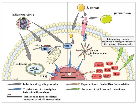 The most prominent PRR-mediated signaling mechanisms, which are induced during co-infection with influenza viruses and S. pneumoniae or S. aureus, resulting in the regulation of cytokine and chemokine expression, are depicted in Figure 2.