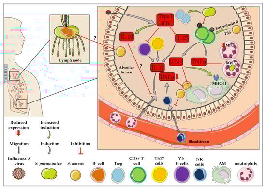 In conclusion, T cell activation can be differentially affected by influenza virus and S. pneumoniae or S. aureus co-infections. Altered secretion of distinct cytokines and chemokines upstream and downstream of T cell activation can have an impact on bacterial as well as viral clearance and, in terms of elevated pro-inflammatory cytokine production in S. aureus co-infections, can lead to a cytokine storm, associated with massive lung damage and severe disease progression.