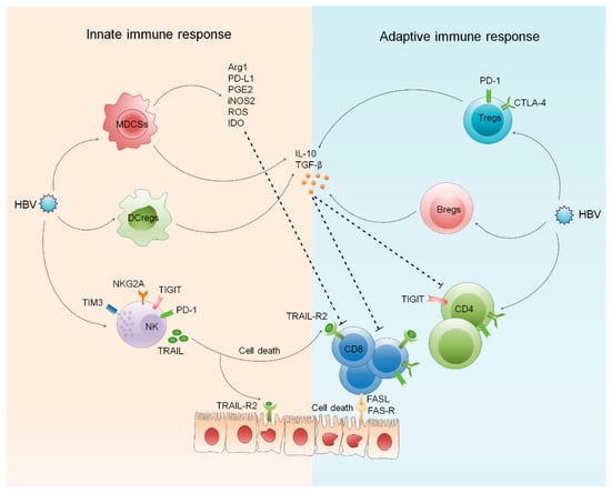 CHB patients are at increased risk of developing fibrosis, cirrhosis, and HCC. Several lines of evidence suggest that HBV itself is non-cytopathic for infected hepatocytes and the liver injury is primarily dictated by the extravagant host immune response. During chronic HBV infection, continuous viral exposure induces the activation of different hepatic immune cells; these cells secrete abundant pro-inflammatory and fibrogenic factors, provoking hepatic inflammation and subsequently fibrosis [141]. Among several immune cells, cytotoxic T lymphocytes were considered as the main culprit for hepatic damage during acute HBV infection [142]. These cells directly kill the infected hepatocytes, which contributes to liver pathogenesis. Nevertheless, the exhaustion of HBV-specific CD8 T cells in chronic HBV infection reveal that these cells are not the only major contributor of liver injury during chronic HBV infection [143]. Rather, infiltration of other mononuclear cells including monocytes and macrophages is also involved. NK cells participate in the inflammatory process even before the intrahepatic recruitment of CTLs. Later on, HBV-specific CTLs induce sufficient toxicity and are involved in viral pathogenesis [144]. Similarly, other immune cells are also linked with the pathogenesis of chronic HBV infection.