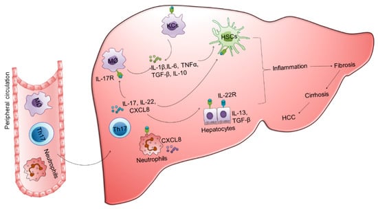 - Paquissi, F.C. Immunity and Fibrogenesis: The Role of Th17/IL-17 Axis in HBV and HCV-induced Chronic Hepatitis and Progression to Cirrhosis. Front. Immunol. 2017, 8, 1195. [Google Scholar] [CrossRef] [PubMed]