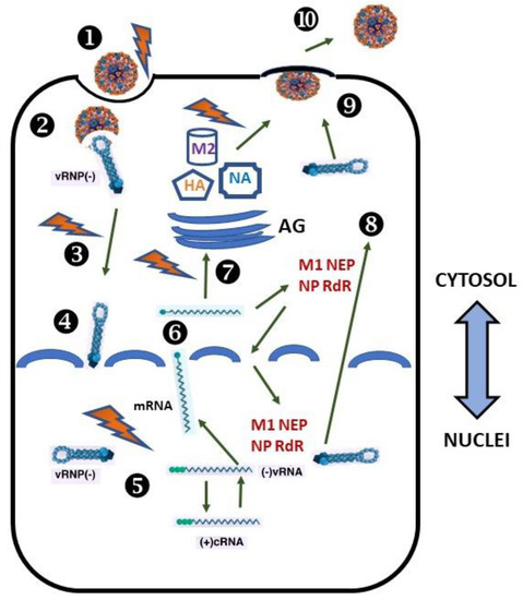 Schematic representation of the important steps of the IAV life cycle. Recognition and attachment (Stage 1). Viral HA (orange) recognizes the terminal α2,6- or α2,3-linked NANA residues in glycan of the sialo-containing receptor on the plasma membrane and attaches to them. Entry (Stage 2). Virus entry to the host cell via endocytosis. Fusion of endosomal and viral membranes and release of viral genome (Stage 3). Once inside the acidic endosomal compartment and after the structural rearrangement of HA, the lipid bilayers of the virus and endosome fuse, and a pore is formed. Transfer to nuclei (Stage 4). Viral genome packed in vRNPs is released into the cytosol through the formed pore. Transcription, replication, and assembly (Stage 5). Later, they are transferred to the nuclei. Transcription and replication of the IAV genome occur at the genomic vRNA in the nuclei. Synthesis and maturation viral proteins (Stage 6 and 7). v-mRNAs are transported into the cytosol and translated on membrane-bound or free polyribosomes. Packaging of vRNPs (Stage 8). Viral proteins that are needed in virus assembly (M1, NP, NEP, and RNA-dependent RNA-polymerase subunits) return to the nucleus to be packaged as vRNPs. Later, they are exported to the cytosol and delivered to the plasma membrane. Budding and realizing virus particles (Stage 9 and 10). Envelope viral proteins (HA, NA, and M2) are synthesized on the rough ER and enter the cellular secretory pathway. Here, HA and NA co-translationally acquire the N-carbohydrate block, which completes their maturation in the Golgi. After that, they are transported via post-Golgi transport machinery to the PM and meet the vRNPs. Here, the budding and release of progeny viruses occur. Protein M1 assists in the formation of mature virions, using fragments of the lipid bilayer and some proteins of the host cell. The viral NA cleaves sialic acid from cell-surface glycoproteins and glycolipids, and virions are released.