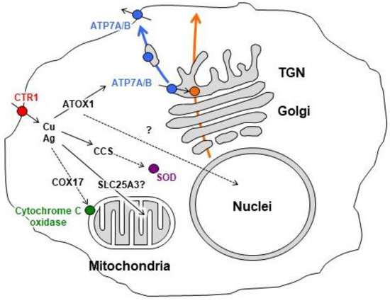 - Puchkova, L.V.; Broggini, M.; Polishchuk, E.V.; Ilyechova, E.Y.; Polishchuk, R.S. Silver ions as a tool for understanding different aspects of copper metabolism. Nutrients 2019, 11, 1364. [Google Scholar] [CrossRef]