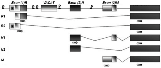Both ChAT and VAChT genes have different splicing variants. The splicing sequences of both genes were reconstructed on the basis of published data [38,39]. Selective primers were designed in order to discriminate the R1, R2, N1, N2, and M forms of the ChAT gene (Figure 2) and the R, V1/V2, and V3 forms of the VAChT gene (Figure 1) (see also Table S1 in supplementary materials).