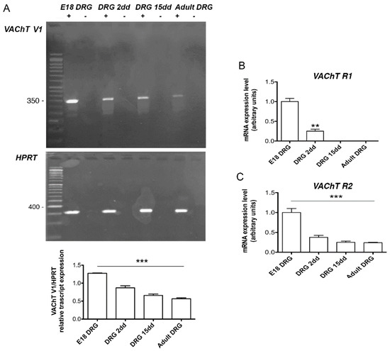 (A) Representative RT-PCR analysis of V1 VAChT splice variants at embryo E18, postnatal 2 and 15, and in adult DRG. HPRT was used as a housekeeping gene. The graph below reports the densitometric analysis of the bands normalized with respect to the HPRT housekeeping gene. The data are the mean of three independent experiments (*** p < 0.001); (B,C) Analysis by qRT-PCR of the R1 and R2 VAChT splice variants. The samples were compared with the respective E18 DRG sample. The data are the mean of three independent experiments performed in triplicate. (** p < 0.01; *** p < 0.001).