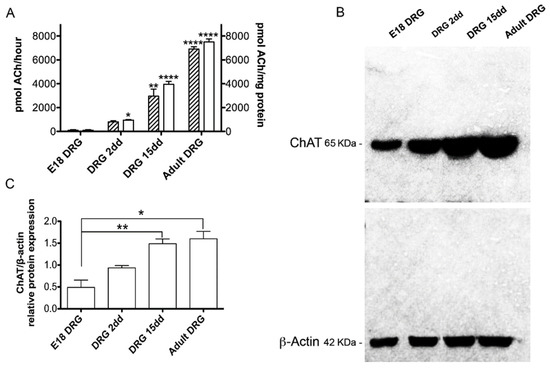 (A) ChAT activity was measured in DRG extracts at the E18, DRG 2dd; DRG 15dd; Adult DRGs. ChAT activity was reported as the total activity (pmol ACh tot/h) or specific activity (pmol ACh synthesized/mg of protein/h). All the samples were compared with the respective E18 DRG sample. Data are the mean ± SEM of at least 3 independent experiments performed in duplicate. (B) Representative Western blot analysis of the ChAT protein at E18, DRG 2dd; DRG 15dd; Adult DRGs. The graph (C) shows the densitometric analysis of the bands obtained after normalization with β-actin used as a protein reference. The data are the mean ± SEM of four independent experiments. All the samples were compared with the respective E18 DRG sample. (* p < 0.05; ** p < 0.01; **** p < 0.0001).