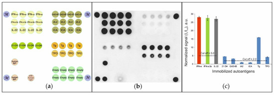 (a) Microarray configuration; (b) fluorescence image of the microarray; and (c) normalized signals from the microarray elements after assay of the serum sample from patient #49 with APS-1. Designations: IFN-ω—ntierferon omega; IFN-α-2a—interferon-alpha-2a; IL-22—interleukin 22; 21-OH—steroid 21 hydroxylase; GAD-65—glutamic acid decarboxylase 65 kDa; IA-2—tyrosine phosphatase-like autoantigen; ICA—islet cell autoantigen 1; TPO—thyroid peroxidase; TG—thyroglobulin; M—marker; human IgG—human immunoglobulin G; anti-human IgG—mouse anti-human immunoglobulin G; Empty—reference gel elements without immobilized protein.