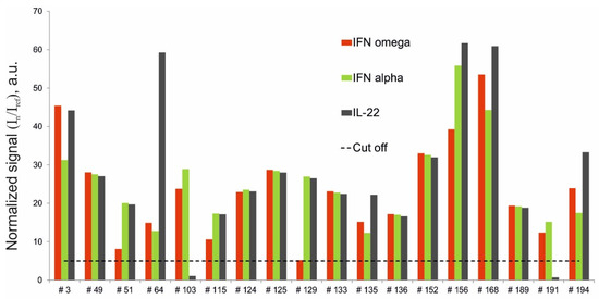 Since our study included patients over 18 years of age, the data obtained confirm the following results of previous studies: autoantibodies against type I interferons can be detected in adulthood, as well as in childhood [35], and titers of autoantibodies against IFN-ω, IFN-α-2a and IL-22 are almost always initially high and persist for decades after the onset of APS-1 [9]. Although the developed method is not intended to quantitatively measure the levels of autoantibodies, importantly, the levels of the recorded signals for autoantibodies against IFN-ω, IFN-α-2a and IL-22 were noticeably higher than those of signals from organ-specific autoantibodies, such as those against 21-OH, GAD-65, IA2, ICA, TG and TPO, consistent with previous data [15].