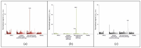 In this study, a microarray-based multiplex assay was proposed for simultaneous detection of both organ-specific (anti-21-OH, anti-GAD-65, anti-IA2, anti-ICA, anti-Tg, and anti-TPO) and cytokine-specific (anti-IFN-ω, anti-IFN-α-2a, and anti-IL-22) autoantibodies that can be major biomarkers of autoimmune polyglandular syndromes. It is generally accepted that almost all APS-1 patients exhibit antibody reactivity to IFN-α and/or IFN-ω subtypes. However, these autoantibodies are also typical for patients with myasthenia gravis and thymoma [29]. Additionally, autoantibodies against type I interferons can be detected in patients with systemic lupus erythematosus (up to 10%), Sjogren’s syndrome (up to 8.7%), rheumatoid arthritis (up to 2%) [30], and incontinentia pigmenti [31].