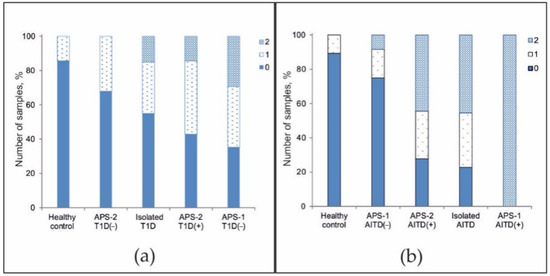 Additionally, we investigated the distribution of the frequency of detected organ-specific autoantibodies associated with T1D and AITDs in patients with isolated disease and in APS patients. At least one of three autoantibodies (GAD-65, IA2, or ICA) was detected in 14.3% of healthy patients (n = 28), in 33.3% of APS-2 patients without a T1D diagnosis (n = 25), in 30.0% of patients with T1D (n = 20), in 42.9% of APS-2 patients with a diagnosis of T1D (n = 14), and in 35.3% of APS-1 patients without a diagnosis of T1D (n = 17) (Figure 5a). In addition, two autoantibodies were detected simultaneously in patients with isolated T1D (15.0%), APS-2 patients with a diagnosis of T1D (14.3%), and patients with APS-1 without T1D (29.4%). Among all patients, only one patient with APS-1 and diagnosed with T1D (#115) was identified to be simultaneously positive for all three autoantibodies associated with T1D (data not shown).