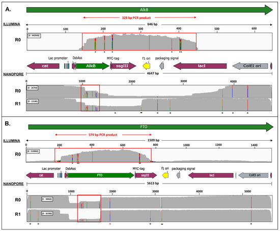 Phagemid DNA of the naive library (R0) and the first selection round (R1) was linearized by ScaI fast digestion for 30 min at 37 °C. Linearized phagemids were purified using the PCR-purification kit (ThermoFisher Scientific) and 1 µg was used for nanopore sequencing. Phagemid DNA was barcoded, adapter-ligated and loaded onto FLO-FLG001 type flow cells following the manufacturers protocol (Oxford Nanopore Technologies, Oxford, UK). Nanopore sequencing was performed on a MinION device for 48 h. Raw sequence data (FASTQ files) were quality-filtered (Q > 10) using NanoFilt [44] (Figure S9), aligned with the wild-type pDST32-AlkB/FTO vector sequence using NGMLR [45] and visualized using IGV (Figure 3). The data analysis for Figures S10 and S11 was performed using the NanoPack toolkit [44].