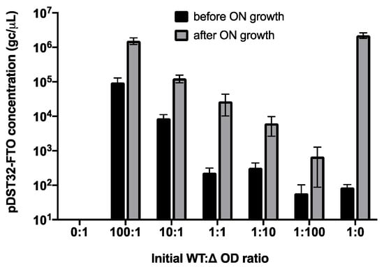 Evolution of pDST32-FTO phagemid copy numbers in mixed cultures of competing TG1/pDST32-FTO (WT) and TG1/pDST32-∆ssgIII (∆) cells. Medium was inoculated with different amounts of cells in the corresponding ratios (1 amount equalled OD = 0.001) and grown overnight at 37 °C. pDST32-FTO phagemid concentrations (gc/µL) were determined by qPCR using FTO-specific primers (Table S4) before and after overnight growth at 37 °C. A 10-fold dilution series of pDST32-FTO was used as standard. Data are the means of at least three independent replicates.