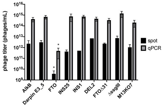 Effects of display on phage production as measured by spot titration and qPCR. FTO phage titers were compared with those of AlkB and Darpin E3_5 [15] display phages, FTO indel variants (INS25, INS1, DEL2, FTO∆31), and phagemid-containing particles lacking the complete FTO-ssgIII fusion gene (∆ssgIII), and M13KO7 helper phage. Data are the means of at least two biological and three technical replicates (except spot titer of INS1 and DEL2). For both methods, the FTO phage titer is ~103 times lower than all other titers (indicated by *; p < 0.05).