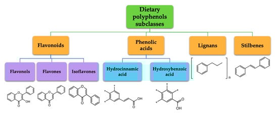 Polyphenols represent a large and varied group of at least 10,000 known different compounds that could be unified by the presence of one or more aromatic rings with one or more hydroxyl groups in their chemical structure [2,3]. For some plant products, for example, some exotic fruits or cereals, the composition of polyphenols is still poorly known [4]. Regarding dietary PC, the current known compounds are about 8000 variants and they are naturally found in common fruits, vegetables, and beverages and, according to the number of phenolic rings they contain, they could be classified into main four subclasses: [5] flavonoids, including flavonols, flavones, isoflavones, flavanones, anthocyanidins, and flavanols; phenolic acids subclass, which is divided between those compounds derived from hydroxybenzoic acids, such as gallic acid, and those derived from hydroxycinnamic acid, like caffeic, ferulic, and coumaric acid; and stilbenes and lignans (Figure 1) [6,7]. In addition to these, there are other subclasses that are not included among the currently known, i.e., alkylphenols, curcuminoids, furanocumarins, hydroxybenzaldehydes, hydroxybenzoketones, tyrosols, and so on [8].