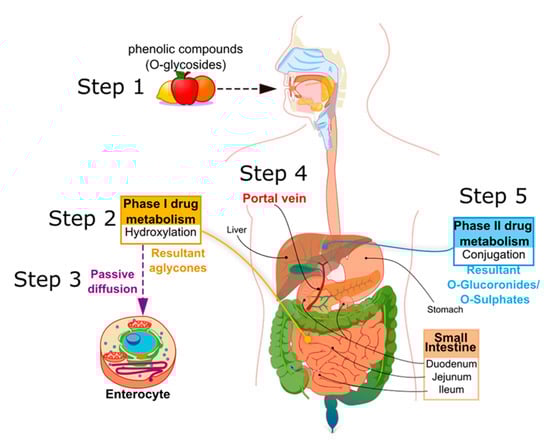 In mammals, PCs are subject to both phases I and II of drug pharmacokinetic metabolism, respectively, as represented in Figure 2. PCs are ingested mainly in a conjugated form, as O-glycosides (step 1, Figure 2). Metabolism of glycosylated PC is initiated in the oral cavity [22], after contact with the glycosidase enzymes of oral microflora, as demonstrated by Kamonpatana et al. [23] for anthocyanidins. However, most PCs continue intact along the digestive tract [22]. On arrival in the stomach and inside the small intestine mucosa, the glycosides are converted by a hydroxylation reaction into their corresponding aglycones (phase I drug metabolism) (step 2, Figure 2). This reaction is assisted by β-glucosidase enzymes expressed by the intestinal microbiota. In this way, aglycones may pass from the gut lumen to the cytosol of the enterocytes, predominantly by passive diffusion (step 3, Figure 2), or by protein carriers, such as P-glycoprotein (P-gp) and co-transporters for sodium-glucose transporter (SGLT1) [24,25,26]. Some hydroxycinnamic acids, such as ellagitannins, are resistant to enzymatic digestion in the small intestine and, therefore, pass directly to the colon, where they are metabolized by microbiota into aglycones [27]. Once the aglycones have been absorbed into the enterocytes or colon cells, they move through the portal vein (step 4, Figure 2) to the liver, where they are further conjugated (phase II drug metabolism) to become O-glucuronides and O-sulphates (step 5, Figure 2). A variable portion of the phenolic conjugates is then excreted into the bile and re-enters the small intestine to undergo the metabolic cycle once again [28,29,30]. Finally, the resultant phenolic conjugates (O-glucoronides/O-sulphates) are transported to the bloodstream by plasma proteins until they are excreted in urine [31,32,33].