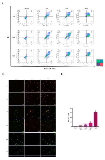 (A) Annexin V-FITC apoptosis assay. U937 cells were treated with different concentrations of 8a (1, 2, and 4 μM) for different lengths of time (24, 48, and 72 h). Propidium iodide can stain necrotic cells or cells that have lost their cell membrane integrity in the late stage of apoptosis red fluorescence. Annexin V-FITC can enter the cytoplasm and bind to phosphatidylserine located on the inner side of the cell membrane, leading to the necrotic cells presenting green fluorescence; 0.1%DMSO was used as a control. (B) Mitochondrial membrane potential. Normal cells’ red fluorescence was reduced, and the green fluorescence of apoptotic cells was enhanced as the concentration of 8a increased (0.5, 1, 2, and 4 μM); Carbonyl cyanate-3-chlorophenylhydrazone (CCCP) was the positive control, and 0.1%DMSO was used as the negative control. The normal cells showed red fluorescence, and the apoptotic cells showed green fluorescence. (C) Reactive oxygen detection. CellROX Deep Red Reagent probe was used to detect the changes of ROS in tumor cells induced by 8a. U937 cells were treated with different concentrations of 8a (0.5, 1, 2, and 4 μM) for 48 h (** p < 0.01); 0.1%DMSO was used as a control.