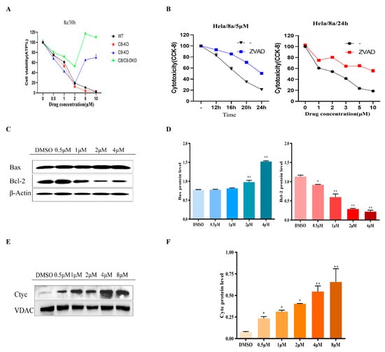 Subsequently, we explored the pathway of apoptosis induced by 8a. Caspase-9 is involved in the activation cascade of caspases and is responsible for the execution of apoptosis. This mitochondria-dependent caspase activation mechanism is referred to as the “intrinsic” pathway of apoptosis []. Caspase-8 is involved in death receptor-mediated exogenous programmed cell death and various apoptotic stimuli []. Therefore, we added different concentrations of 8a (0.5, 1,2, 5, and 10 μM) to caspase-8 and caspase-9 knockout cells to detect cell vitality. The experimental results showed that in caspase-9 knockout cells, the inhibitory effect of 8a on cell activity was weakened, but this phenomenon was not found in caspase-8 knockout cells. Interestingly, in caspase-8 and caspase-9 double knockout cells, the cell viability was enhanced under the influence of 8a. These results indicate that 8a mainly affects the endogenous pathway mediated by mitochondria, and its regulation of the exogenous pathway depends on the mitochondrial pathway (Figure 4A). Z-VAD-FMK is a well-known pan caspase inhibitor []. Therefore, we used Z-VAD-FMK as a positive control to verify whether 8a affected cell apoptosis through a mitochondria-dependent caspase activation mechanism. CCK8 results showed that the effect of 8a on the cells that were inhibited by Z-VAD-FMK was significantly reduced (Figure 4B), which further suggested that 8a induced apoptosis through an endogenous mitochondria-dependent caspase pathway. One pathway of caspase activation is triggered by the release of cytochrome C from the mitochondria into the cytoplasm. In this mitochondrial death pathway, the expression ratio of pro-apoptotic Bax protein to anti-apoptotic Bcl-2 protein ultimately determines cell death or survival [,]. Consequently, we analyzed the basal expression of apoptotic protein markers. It was indicated that 8a could increase the expression of pro-apoptotic Bax protein and cytochrome C in U937 cells. In the meantime, 8a significantly decreased the expression of the anti-apoptotic protein Bcl-2 (Figure 4C–F), and the expression was similar in CCRF-CEM cells and K562 cells (Figure S5). In conclusion, it was revealed that 8a induces apoptosis through endogenous (mitochondrial) pathways.