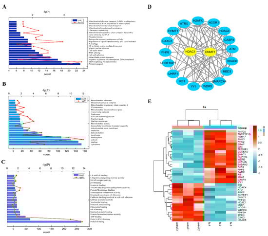 Proteomics analysis. (A–C) The BP (biological process), CC (cell component), and MF (molecular function) of GO were analyzed. (D) Protein–protein interactions to analyze proteins using STRING and cystoscope software. A total of 19 genes were associated with both histone deacetylase 1 (HDAC1) and DNA methyltransferase 1 (DNMT1). (E) A heatmap to analyze differentially expressed proteins down-regulated genes in blue and up-regulated genes in red.