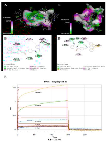 Binding affinity is one of the most important indexes for evaluating the binding effect. We examined the binding specificity and affinity of 8a and DNMT1, using biolayer interferometry (BLI). DNMT1 protein with a His marker was loaded on an NTA sensor chip. 8a was bound to DNMT1 (50 μg/mL) with different concentration gradients. The kinetic curves of association and dissociation are shown in Figure 6E. Analyses of the resulting binding kinetics revealed that 8a displayed a high binding affinity with DNMT1, and the Kd (dissociation constant) value between 8a and DNMT1 protein was 1.90 nM.